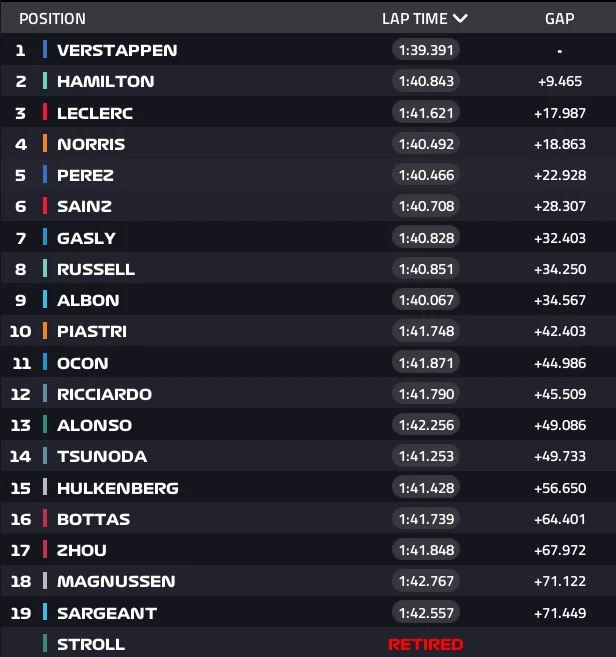 Wspomniany w poprzednim akapicie Carlos Sainz długo bronił się przed Lando Norrisem, co działało na korzyść odjeżdżającemu im Charlesowi Leclercowi. Kierowca McLarena na dziesiątym kółku wreszcie dopiął swego, ale zabrakło mu już dystansu na dogonienie solidnego w ten weekend Monakijczyka. Najważniejszy wyścig trzeciego w sprincie zawodnika Ferrari czeka jednak dopiero jutro, bo wystartuje z pole position. Max Verstappen natomiast będzie przebijał się do czołówki z trzeciego rzędu.