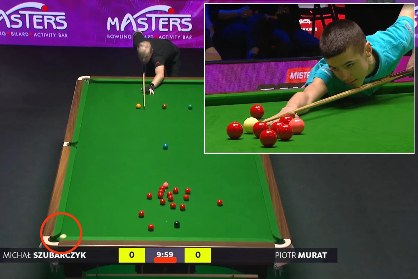 Czerwone bile na stole rozbijał Murat - uczynił to tak pechowo, że bardziej już chyba nie można. Biała źle się odbiła od skrajnej czerwonej, poleciała do lewej dolnej kieszeni. A to oznaczało cztery punkty karne i możliwość ustawienie białej przez Szubarczyka w dowolnym miejscu na stole.