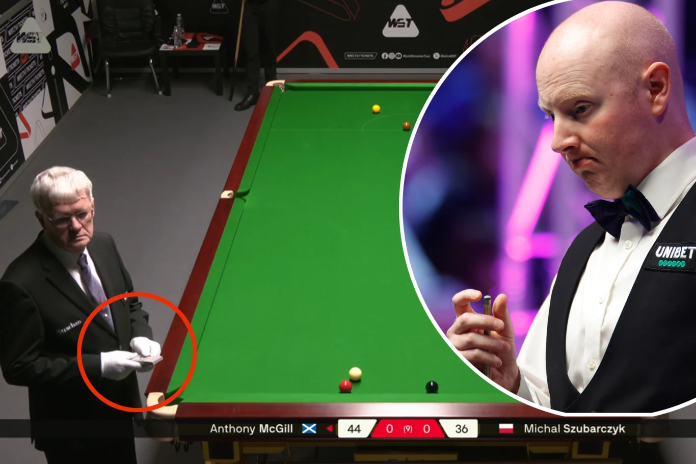 McGill popełnił faul - za cztery punkty, które trafiły na konto Polaka. Sędzia musiał odtworzyć ustawienie bil na monitorze, od razu sięgnął po pilota. Za drugim razem Szkot zdołał dotoczyć białą do czerwonej, ale Michał ustawił drugą pułapkę. Tym razem rywal dwa razy popełnił faule - oba sześciopunktowe, bo uderzał w różową. Szubarczyk objął prowadzenie 52:44, ale wkrótce role się odwróciły.