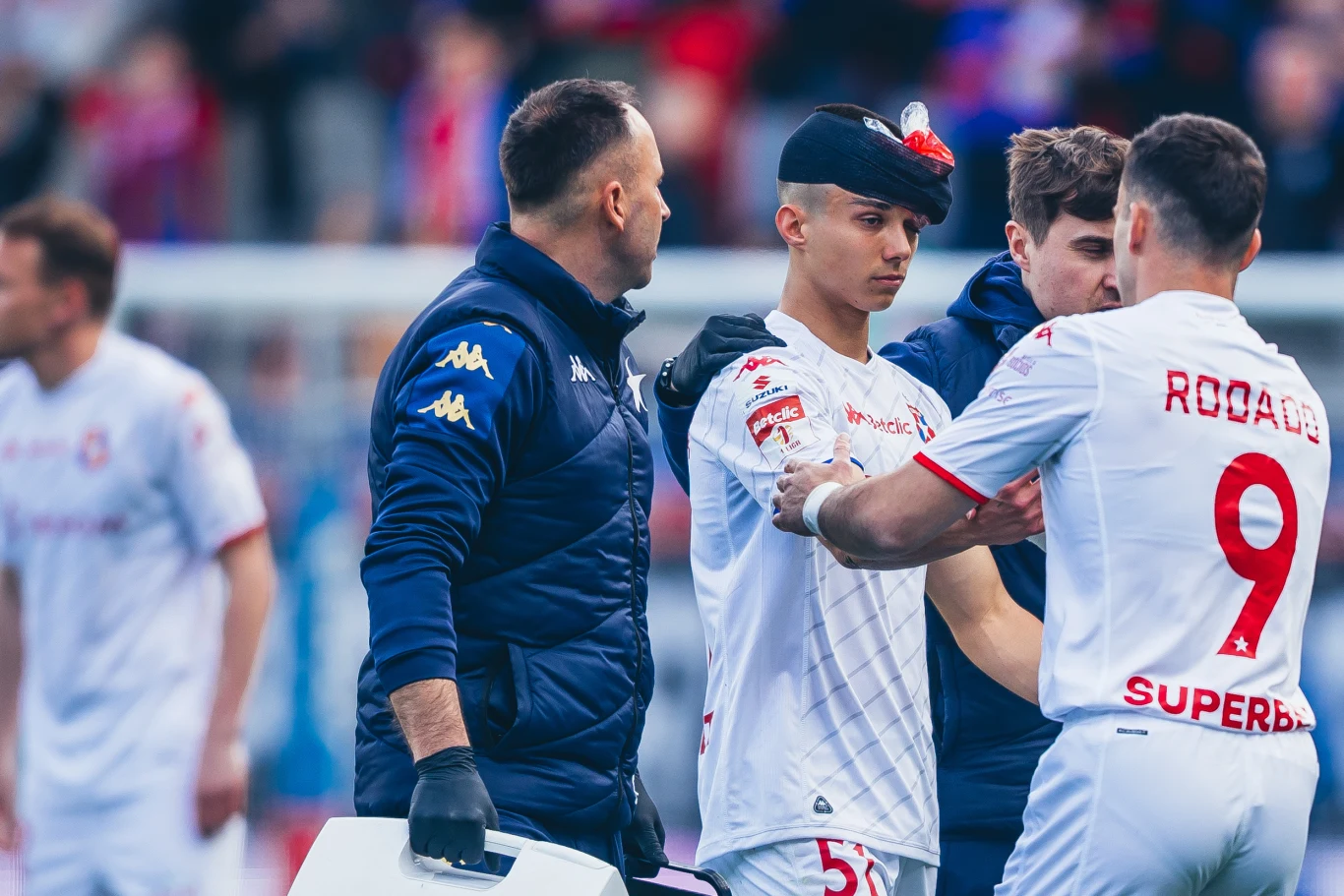 Jordi Sanchez już w pierwszej akcji meczu został trafiony piłką, a gdy spadał na murawę, skręcił staw skokowy i na razie nie wiadomo, jak poważny jest uraz. Niedługo potem w walce o piłkę Mateusz Spychała uderzył głową Kuziemkę.