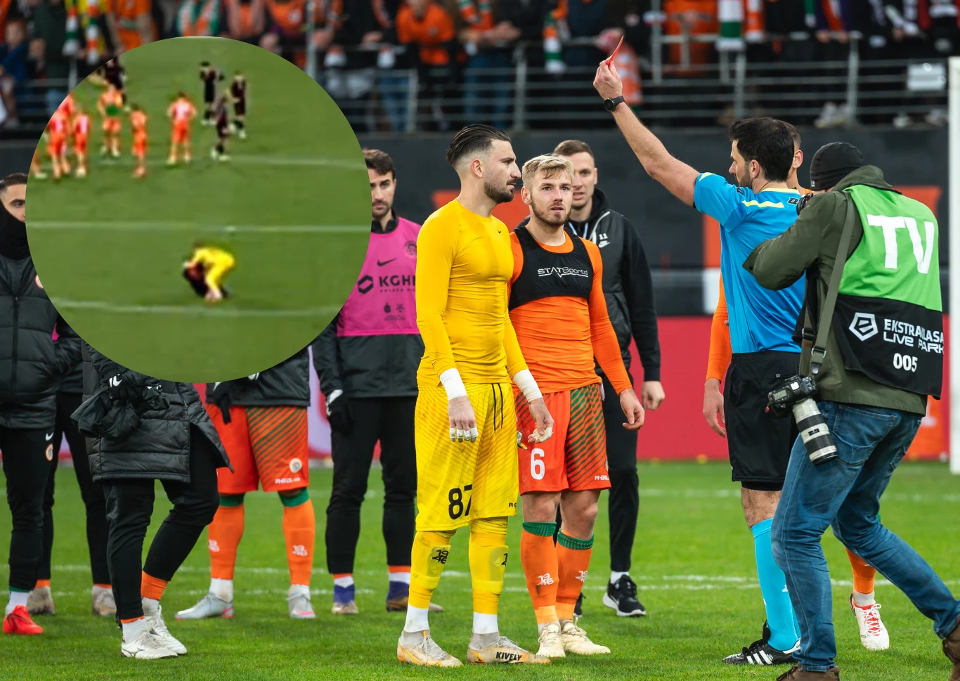 To jednak nie było koniec. Po ostatnim gwizdku część piłkarzy dziękowała sobie za grę. Z boku stali Dioudis i Sanchez. Po chwili bramkarza Zagłębia powalił Hiszpana. Rozpoczęła się awantura między drużynami. Na pomoc napastnikowi rzucili się piłkarze Widzewa. Kiedy udało się rozdzielić, sędzia po raz piąty pokazał, że idzie skorzystać z VAR. Obejrzał zajść na boisku i ukarał greckiego bramkarza bezpośrednią czerwoną kartką.