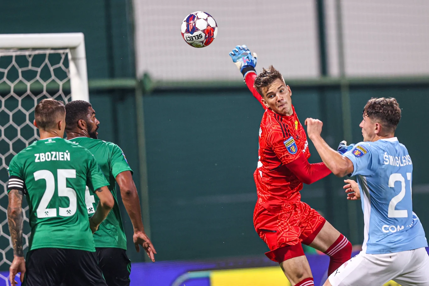 Prowadzenie dla gości padło w 45. minucie. Po dośrodkowaniu Pawła Jaroszyńskiego piłkę głową odbił Souleymane Cissé, ta poleciała w kierunku bramki, gdzie Woźniak zastawiany przez Kacpra Śmiglewskiego, nie był w stanie ani złapać, ani wybić piłki i ta wpadła do siatki.