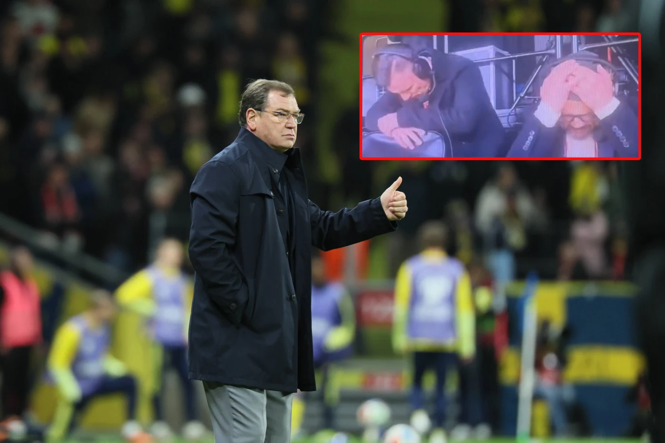 To spotkanie na antenie TVP Sport komentowali Jacek Laskowski i Robert Podoliński. W momencie, gdy Polacy stracili gola obaj właściwie synchronicznie złapali się za głowy i załamali ręce. Ich reakcje można było obserwować na specjalnej transmisji z kamerą na komentatorów.