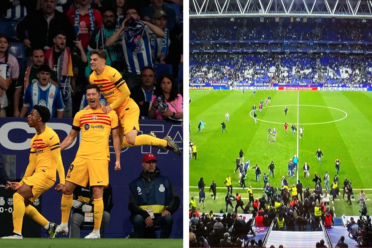 Drużyna FC Barcelony przypieczętowała zdobycie mistrzostwa Hiszpanii zwycięstwem 4-2 nad lokalnym rywalem, czyli Espanyolem na jego boisku. Kiedy Robert Lewandowski i jego koledzy zaczęli świętowanie po ostatnim gwizdku, radosne śpiewy "Campeones" i tańce piłkarzy Barcelony zostały brutalnie przerwane przez inwazję kibiców Espanyolu na murawę.
