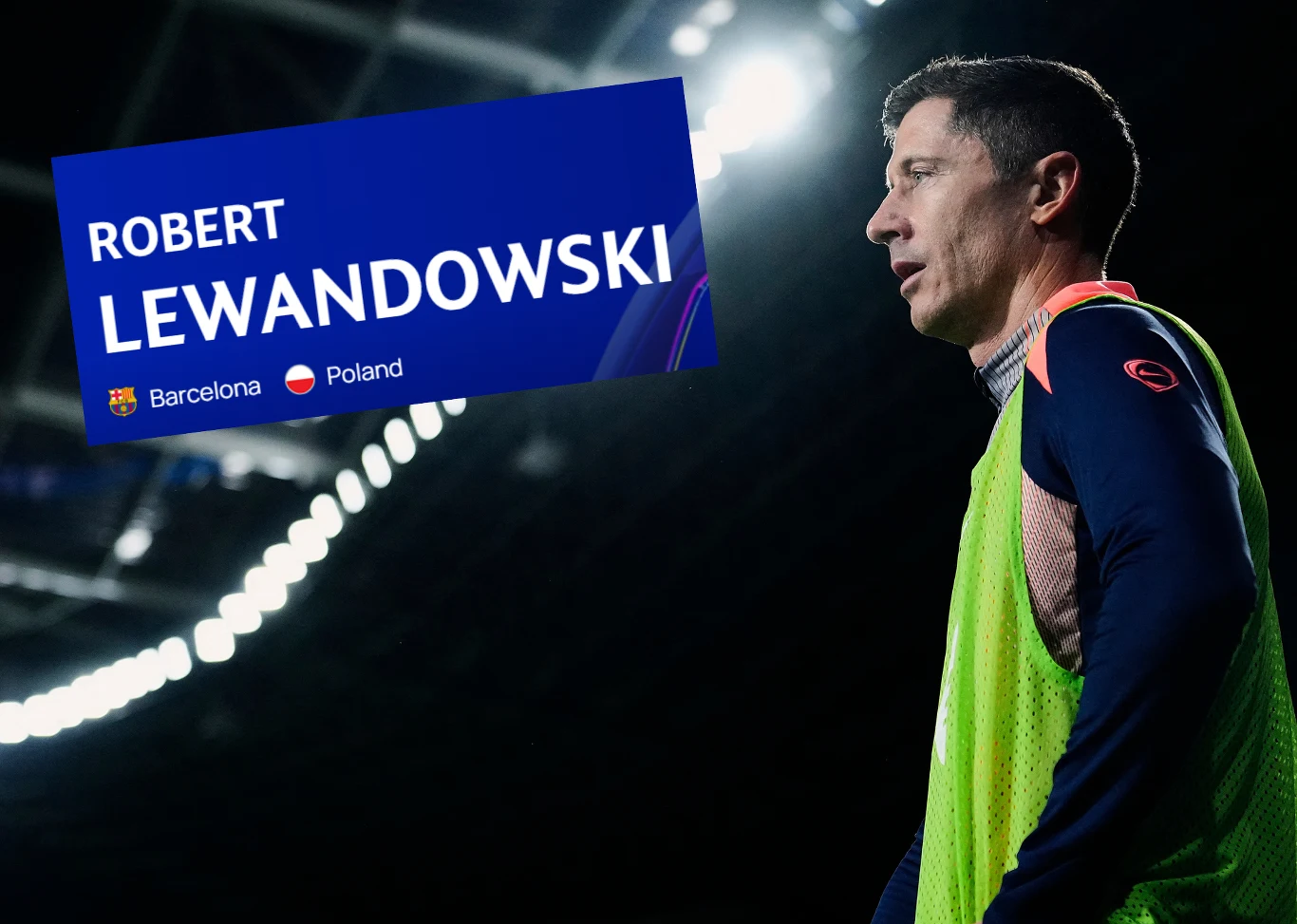 Piłkarz Robert Lewandowski w stroju treningowym na stadionie, z wyraźnie widocznym nazwiskiem oraz informacją o jego przynależności klubowej i narodowej na planszy graficznej. Jasne oświetlenie stadionowe w tle podkreśla postać sportowca.