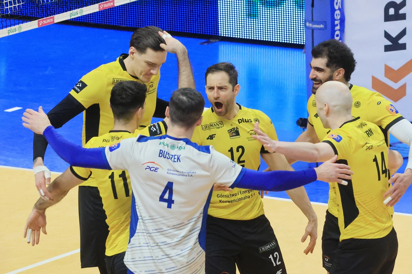 PGE GiEK Skra: Amin, Lemański, Kujundzić, Łomacz, Wiśniewski, Perić - Marek (libero) oraz W. Nowak, Szalacha