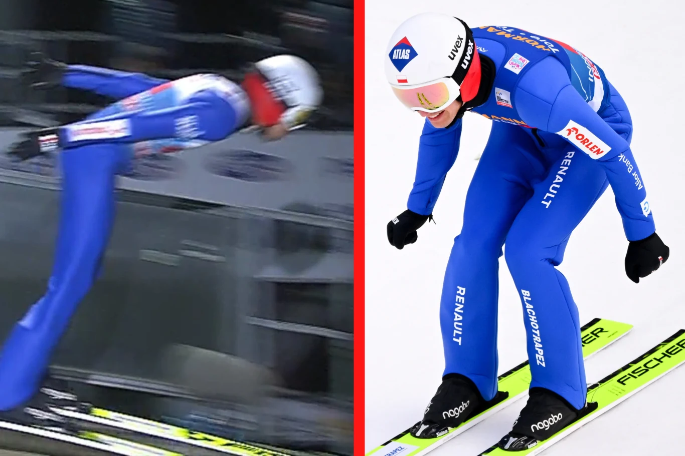 Kamil Stoch mógł polecieć zdecydowanie dalej, lecz znacznie spóźnił swój skok. Tym bardziej należą mu się pochwały za to, ile zdołał wyciągnąć ze swojej finałowej próby. Błąd Polaka przy wybiciu świetnie obrazują ujęcia wychwycone przez dziennikarza Viaplay - Piotra Majchrzaka.