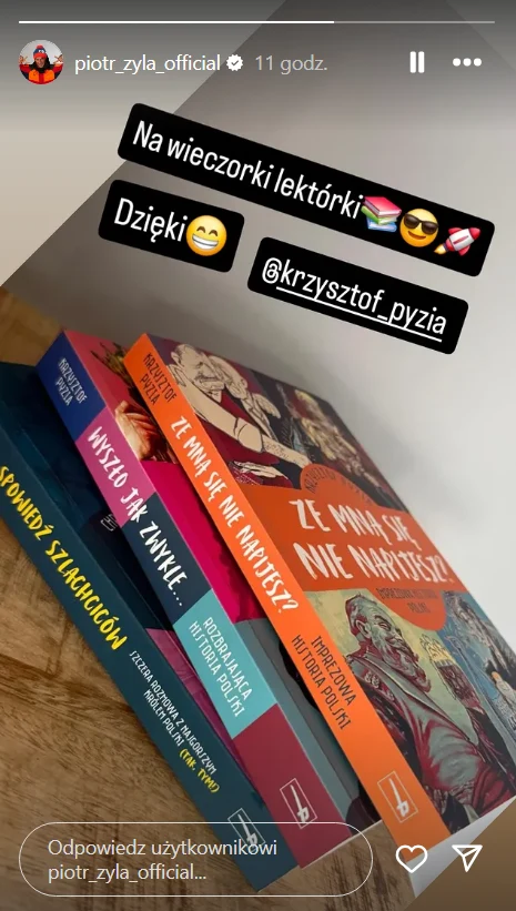 Piotr Żyła od razu zapowiedział, że zabierze się za czytanie już wieczorem. "Na wieczorki lektórki. Dzięki" (pisownia oryginalna) - pisał sportowiec, oznaczając przy tym autora. Zdaje się, że już niebawem na poważnie zabierze się za czytanie. Oby pozycje, które wybrał, mu się spodobały.