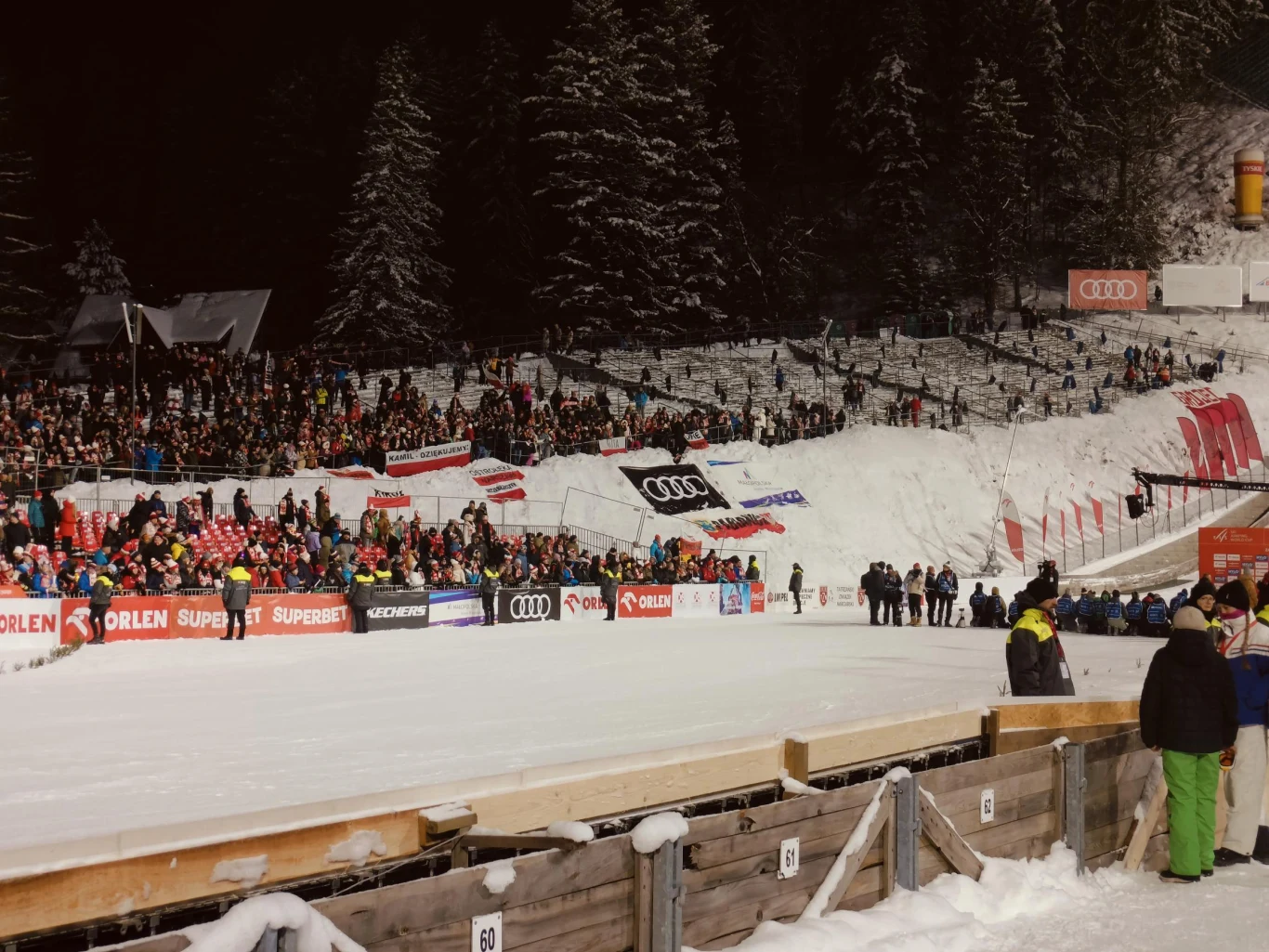 Zaraz po konkursie tysiące polskich kibiców opuściło skocznię, jakby zapomnieli, że jest ceremonia dekoracji. W sumie trudno się dziwić, skoro tyle lat czekaliśmy na polskie podium. Trybuny mocno się przerzedziły, co w przeszłości nie zdarzało się, kiedy Polacy stawali na podium.