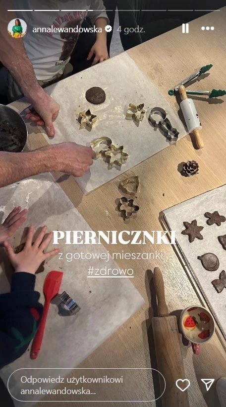 Wiadomo, że najlepsze pierniczki to takie, które chwilę odstoją w odpowiednich opakowaniach, trudno więc ocenić, czy Lewandowska próbowała już przygotować jedzenie na święta, czy na razie próbuje nowych rzeczy, by móc je później wykorzystać. Razem z dziewczynkami wycinała pierniczki z ciasta przygotowanego z gotowej mieszanki.