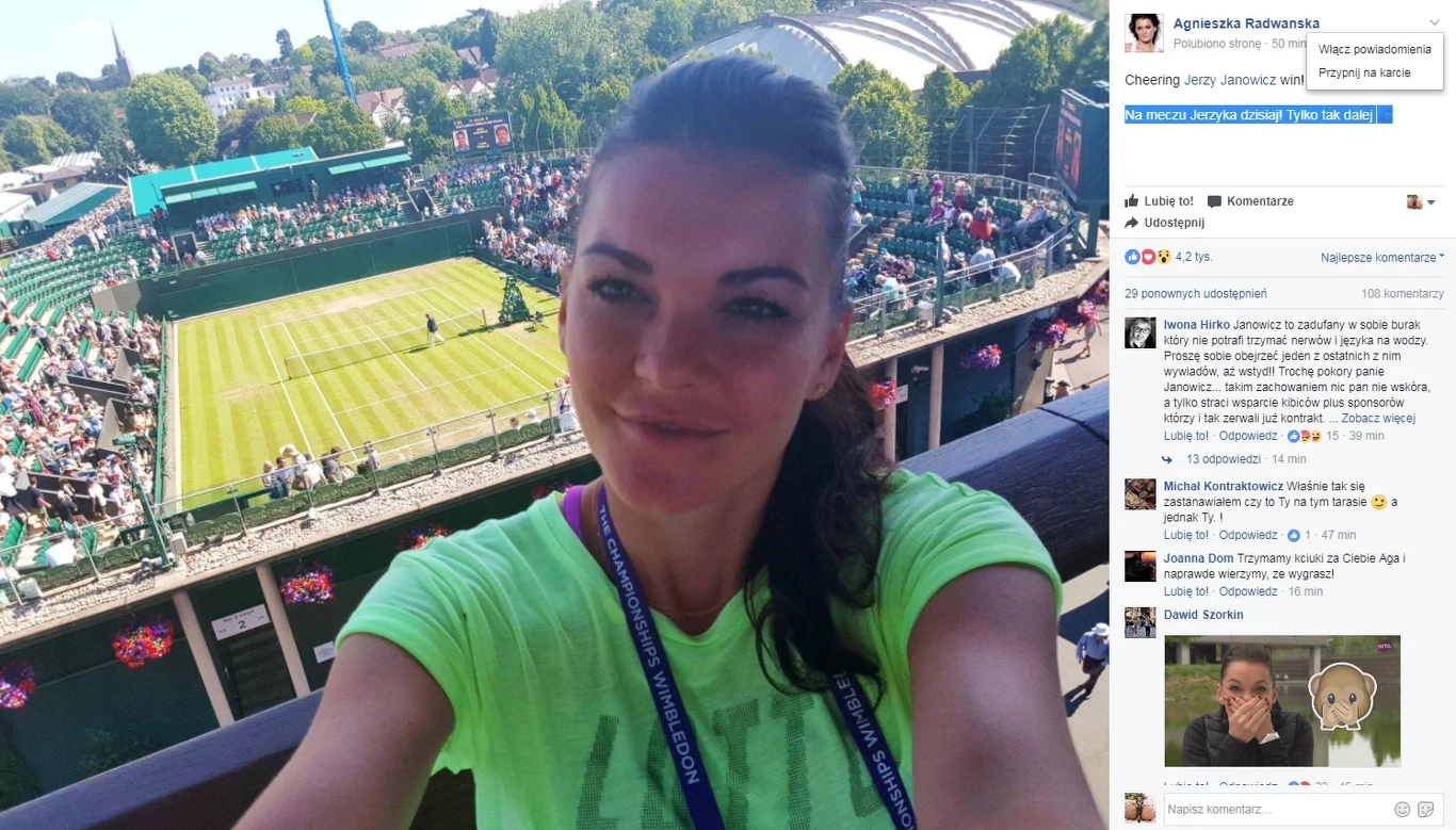 Agnieszka Radwańska kibicowała Jerzemu Janowiczowi podczas meczu II rundy Wimbledonu. I pomogła!